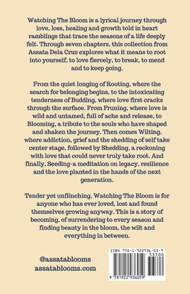 Watching The Bloom is a lyrical journey through love, loss, healing and growth told in heart ramblings that trace the seasons of a life deeply felt. Through seven chapters, this collection from Assata Dela Cruz explores what it means to root into yourself, to love fiercely, to break, to mend and to keep going. From the quiet longing of Rooting, where the search for belonging begins, to the intoxicating tenderness of Budding, where love first cracks through the surface. From Pruning, where love is wild and untamed, full of ache and release, to Blooming, a tribute to the souls who have shaped and shaken the journey. Then comes Wilting, where addiction, grief and the shedding of self take center stage, followed by Shedding, a reckoning with love that could never truly take root. And finally, Seeding-a meditation on legacy, resilience and the love planted in the hands of the next generation. Tender yet unflinching, Watching The Bloom is for anyone who has ever loved, lost and found themselves growing anyway. This is a story of becoming, of surrendering to every season and finding beauty in the bloom, the wilt and everything in between.