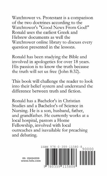 A comparison between the Watchtower's doctrine and the Protestant doctrine. Todays technology allows us to research the earliest biblical writings. Understanding the correct context and definitions of the original language is a must for proper biblical exegesis. This book is not only for the avid apologist, but allows for answers during general conversation between a Jehovah Witness and a Protestant. The book is small enough to be put into a pocket, purse, glove box, or anywhere else handy for quick reference. This book is useful for the Jehovah Witness and the Christian to better understand each others doctrines for casual or serious debate.