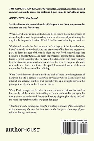 THE REDEMPTION SERIES: 100 years after Margaret Anne transformed an American family, comes the profound 4-part finale to the Calhoun saga. BOOK FOUR: Watchword Sacrifice birthed the unsettled world of Margaret Anne. Now, only surrender can pave the way for closure. When David returns from exile, he and Miss Sonny begin the process of reconciling the sins of the past, seeking the favor of a secret ally, and setting the stage for the long-awaited arrival of David's final hours of reckoning and sacrifice. Watchword unveils the final remnants of the legacy of the Spanish Cross, David's divinely inspired task, and the last secrets of his dark and mysterious past. To learn the rest of the truth, clear the way for the new things that belong to a brighter future, and begin the process of atoning for his past sins, David is forced to resolve what he may of his relationship with his irreparably heartbroken and delusional mother, declare his true feelings for the only woman he ever loved, and invoke the spiteful, two-sided nature of the man responsible for the worst of his suffering. What David discovers about himself and each of those unyielding forces of nature in his life is certain to captivate any reader who is fascinated by the internal and external conflicts that exemplify the epic struggle between the principalities of good and evil here on earth. When David accepts the fact that he must embrace a position that renders him nearly helpless unless he is willing to do the unthinkable yet again, he finally comes to understand the joy and beauty of giving his life up to God. He hears the watchword that was given long ago. "Watchword" is the exciting and thought-provoking conclusion of the Redemption series, uncovering the next intricate layer to the Margaret Anne saga of fate, faith, reckoning, and mercy.