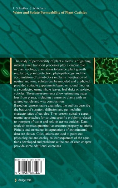 The study of permeability of plant cuticles is gaining interest since transport processes play a crucial role in plant ecology, plant stress tolerance, plant growth regulation, plant protection, phytopathology and the accumulation of xenobiotics in plants. Penetration of neutral and ionic solutes can be modeled and predicted, provided suitable experiments based on sound theories are conducted using whole leaves, leaf disks or isolated cuticles. These measurements allow estimating water loss from plants, including transgenic plants with an altered cuticle and wax composition. Based on representative examples, the authors describe the basics of sorption, diffusion and permeability characteristics of cuticles. They present suitable experimental approaches, including data analysis, hints to erroneous interpretations and calculations to point out the physiological and ecological consequences.