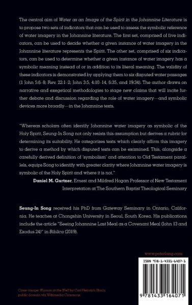 "Whereas scholars often identify Johannine water imagery as symbolic of the Holy Spirit, Seung-In Song not only resists this assumption but derives a rubric for determining its suitability. He categorizes texts which clearly affirm this imagery to derive a method by which disputed texts can be examined. This, alongside a carefully derived definition of 'symbolism' and attention to Old Testament parallels, equips Song to identify with greater clarity where Johannine water imagery is symbolic of the Holy Spirit and where it is not." Daniel M. Gurtner, Ernest and Mildred Hogan Professor of New Testament Interpretation at The Southern Baptist Theological Seminary
