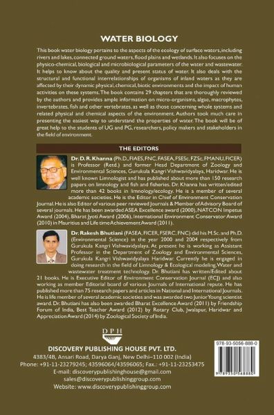 This book water biology pertains to the aspects of the ecology of surface waters, including rivers and lakes, connected ground waters, flood plains and wetlands. It also focuses on the physico-chemical, biological and microbiological parameters of the water and wastewater.