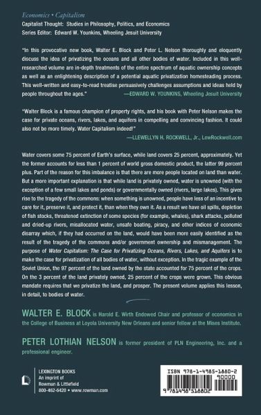 Water Capitalism proposes the privatization of all bodies of water, because those who own resources husband their assets far more carefully than do bureaucrats who have no real stake in the environment. The idea that an all-powerful state should, or could, care for the physical liquid environs of the world is shown to be incorrect and immoral.