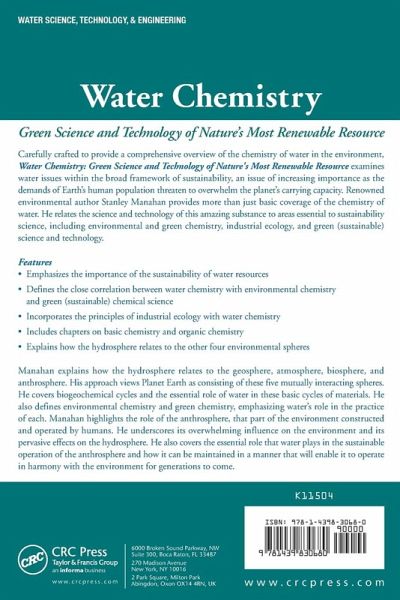 Written by top environmental author Stanley Manahan, this book takes an unusual approach to the chemistry of water. It focuses on water as a renewable resource from a green chemistry and sustainability perspective. An appropriate text for a course in current affairs in environmental chemistry, the book examines the hydrosphere and explains how it relates to the other four environmental spheres. It contains chapters on basic chemistry and organic chemistry useful to those readers whose fundamental knowledge of chemistry is limited and includes coverage of pollution, wastewater, and water treatment.