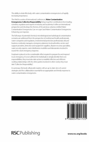In the current international situation, the ability to deal effectively with water contamination emergencies is of rapidly increasing importance. The third in a series of conference proceedings, this book brings together contributions from leading scientists and experts in industry and academia. It offers an international perspective and develops the themes of the previous volumes entitled Water Contamination Emergencies: Can we cope? and Water Contamination Emergencies: Enhancing our response. The full range of potential chemical, microbiological and radiological contamination scenarios are addressed from the perspective of medical and health professionals, water companies and regulators, environmental protection professionals, risk and business continuity managers, emergency planners, local authorities, service and support providers, detection and equipment suppliers, disaster recovery specialists, water security experts, water distribution modellers and laboratories involved in round the clock emergency response. Emphasis is placed on the considerable effort required to prepare for and respond to an emergency. It is not sufficient for Individuals to simply identify their own responsibilities, they must also take action to establish effective and efficient working relationships with the other parties involved. In other words, they must take "Collective Responsibility". In summary, this book will provide readers with an up-to-date view of current strategies and the collaboration essential for an appropriate and timely response to water contamination emergencies.