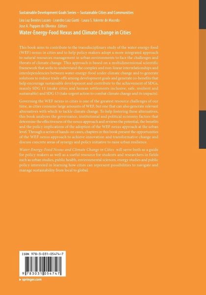This book aims to contribute to the transdisciplinary study of the water-energy-food (WEF) nexus in cities and to help policy makers adopt a more integrated approach to natural resources management in urban environments to face the challenges and threats of climate change. This approach is based on a multidimensional scientific framework that seeks to understand the complex and non-linear interrelationships and interdependencies between water-energy-food under climate change and to generate solutions to reduce trade-offs among development goals and generate co-benefits that help encourage sustainable development and contribute to the achievement of SDGs, mainly SDG 11 (make cities and human settlements inclusive, safe, resilient and sustainable) and SDG 13 (take urgent action to combat climate change and its impacts).