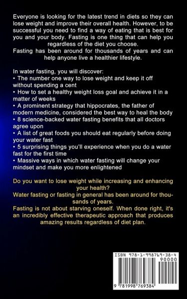 Everyone is looking for the latest trend in diets so they can lose weight and improve their overall health. However, to be successful you need to find a way of eating that is best for you and your body. Fasting is one thing that can help you regardless of the diet you choose. Fasting has been around for thousands of years and can help anyone live a healthier lifestyle. In water fasting, you will discover:The number one way to lose weight and keep it off without spending a cent How to set a healthy weight loss goal and achieve it in a matter of weeks A prominent strategy that hippocrates, the father of modern medicine, considered the best way to heal the body 8 science-backed water fasting benefits that all doctors agree upon A list of great foods you should eat regularly before doing your water fast 5 surprising things you'll experience when you do a water fast for the first time Massive ways in which water fasting will change your mindset and make you more enlightened Do you want to lose weight while increasing and enhancing your health? Water fasting or fasting in general has been around for thousands of years. Fasting is not about starving oneself. When done right, it's an incredibly effective therapeutic approach that produces amazing results regardless of diet plan.