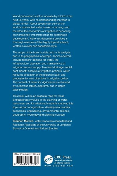 World population is set to increase by a third in the next 25 years, with no corresponding increase in global rainfall. About seventy per cent of the world's abstracted water is used in farming and therefore the economics of irrigation is becoming an increasingly important issue for sustainable development. Water for Agriculture provides a thorough overview of this highly topical subject, written in a clear and accessible style. The Scope of the book is wide both in its analysis and in its geographical coverage. Topics covered include the infrastructure, operation and maintenance of irrigation service supply, the supply of drainage services, economic cost benefit analysis, water resource planning at the regional scale, political economy and irrigation policy. The content of Water for Agriculture is enhanced by numerous tables, diagrams, and in-depth case studies. This book will be an essential read for those professionals involved in the planning of water resources, and for advanced students studying this topic as part of agriculture, development studies, economics, engineering, environmental science, geography, hydrology and planning courses.