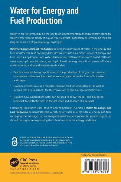 Water, in all its forms, may be the key to an environmentally friendly energy economy. Water is free, there is plenty of it, plus it carries what is generally believed to be the best long-term source of green energy-hydrogen. Water for Energy and Fuel Production explores the many roles of water in the energy and fuel industry. The text not only discusses water's use as a direct source of energy and fuel-such as hydrogen from water dissociation, methane from water-based clathrate molecules, hydroelectric dams, and hydrokinetic energy from tidal waves, off-shore undercurrents, and inland waterways-but also: Describes water's benign application in the production of oil, gas, coal, uranium, biomass, and other raw fuels, and as an energy carrier in the form of hot water and steam Examines water's role as a reactant, reaction medium, and catalyst-as well as steam's role as a reactant-for the conversion of raw fuels to synthetic fuels Explains how supercritical water can be used to convert fossil- and bio-based feedstock to synthetic fuels in the presence and absence of a catalyst Employing illustrative case studies and commercial examples, Water for Energy and Fuel Production demonstrates the versatility of water as a provider of energy and fuel, conveying the message that as energy demand and environmental concerns grow, so should our vigilance in pursuing the role of water in the energy landscape.
