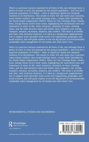 1. Introduction and Scope 2. Earth's Water Resources 3. Chemistry of Water 4. Drinking Water: Global Perspective 5. Domestic Water: Supply and Demand 6. Drinking Water: From Source to Tap 7. Water and Health 8. Water and Food 9. Water and Irrigation 10. Water and Soil 11. Water and Energy 12. Water for Transport 13. Water for Industry 14. Water and Recreation 15. Water and Disasters 16. Water Related Conflicts Appendix: Names in use for water in some languages