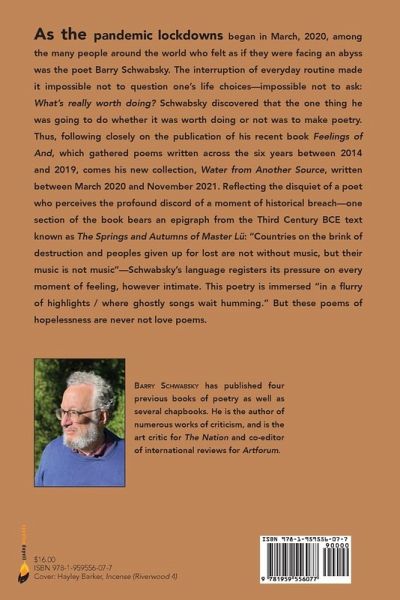 As the pandemic lockdowns began in March, 2020, among the many people around the world who felt as if they were facing an abyss was the poet Barry Schwabsky. The interruption of everyday routine made it impossible not to question one's life choices-impossible not to ask: What's really worth doing? Schwabsky discovered that the one thing he was going to do whether it was worth doing or not was to make poetry. Thus, following closely on the publication of his recent book Feelings of And, which gathered poems written across the six years between 2014 and 2019, comes his new collection, Water from Another Source, written between March 2020 and November 2021. Reflecting the disquiet of a poet who perceives the profound discord of a moment of historical breach-one section of the book bears an epigraph from the Third Century BCE text known as The Springs and Autumns of Master Lü: "Countries on the brink of destruction and peoples given up for lost are not without music, but their music is not music"-Schwabsky's language registers its pressure on every moment of feeling, however intimate. This poetry is immersed "in a flurry of highlights / where ghostly songs wait humming." But these poems of hopelessness are never not love poems.