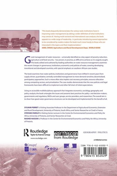 Good management of water resources - universally identified as a key aspect of poverty reduction, agriculture and food security - has proven, in practice, as difficult to achieve as it is eagerly sought. This book, edited and authored by leading authorities on water resource management, examines the recent changes in governance, institutions, economics and policies of water, covering developing, transitional and developed countries, with special emphasis on southern African case studies. The book examines how water policies, institutions and governance have shifted in recent years from supply-driven, quantitative, centrally controlled management to more demand-sensitive, decentralized, participatory approaches. Such a move often also implies cost recovery principles, resource allocation among competing sectors, and privatization. The case studies demonstrate that the new policies and legal frameworks have been difficult to implement and often fall short of initial expectations. Using an accessible multidisciplinary approach that integrates economics, sociology, geography and policy analysis, the book untangles the issues and presents best practices for policy- and decision-makers, governments and regulators, NGOs and user groups, service providers, and researchers. The overall aim is to show how good water governance structures can be developed and implemented for the benefit of all.