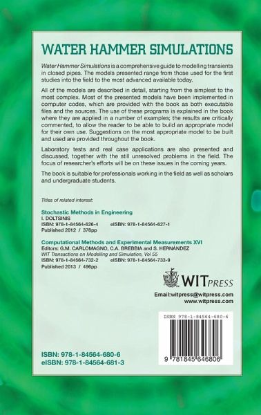 Water Hammer Simulations is a comprehensive guide to modelling transients in closed pipes. The models presented range from those used for the first studies into the field to the most advanced available today. All of the models are described in detail, starting from the simplest to the most complex. Most of the presented models have been implemented in computer codes, which are provided with the book as both executable files and the sources. The use of these programs is explained in the book where they are applied in a number of examples; the results are critically commented, to allow the reader to be able to build an appropriate model for their own use. Suggestions on the most appropriate model to be built and used are provided throughout the book. Laboratory tests and real case applications are also presented and discussed, together with the still unresolved problems in the field. The focus of researcher's efforts we will be on these issues in the coming years. The book is suitable for professionals working in the field as well as scholars and undergraduate students.