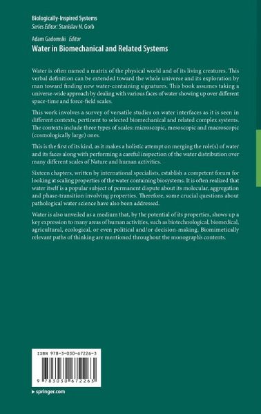 The content of the proposed work can be distributed twofold. First, the biomechanical mammalian-type (or, similar) systems with extraordinary relevance of water for their functioning will be presented, also including a presentation of water itself as a key physicochemical system/medium. Second, the suitably chosen related systems, mainly of soil and plant addressing provenience, will be examined thoroughly. As a common denominator of all of them, it is proposed to look at their hydrophobic and/or (de)hydration effects, and how do they impact on their basic mechanical (and related, such as chemo-mechanical or piezoelectric, etc.) properties. An additional tacit assumption employed throughout the monograph concerns statistical scalability of the presented biosystems which is equivalent to take for granted a certain similarity between local and global system's properties, mostly those of mechanical nature. The presented work's chapters also focus on biodiversity and ecological aspects in the world of animals and plants, and the related systems. The chapters' contents underscore the bioinspiration as the key landmark of the proposed monograph.
