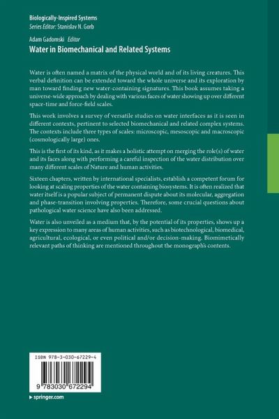 The content of the proposed work can be distributed twofold. First, the biomechanical mammalian-type (or, similar) systems with extraordinary relevance of water for their functioning will be presented, also including a presentation of water itself as a key physicochemical system/medium. Second, the suitably chosen related systems, mainly of soil and plant addressing provenience, will be examined thoroughly. As a common denominator of all of them, it is proposed to look at their hydrophobic and/or (de)hydration effects, and how do they impact on their basic mechanical (and related, such as chemo-mechanical or piezoelectric, etc.) properties. An additional tacit assumption employed throughout the monograph concerns statistical scalability of the presented biosystems which is equivalent to take for granted a certain similarity between local and global system's properties, mostly those of mechanical nature. The presented work's chapters also focus on biodiversity and ecological aspects in the world of animals and plants, and the related systems. The chapters' contents underscore the bioinspiration as the key landmark of the proposed monograph.