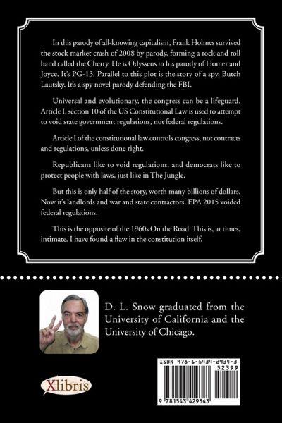 In this parody of all-knowing capitalism, Frank Holmes survived the stock market crash of 2008 by parody, forming a rock and roll band called the Cherry. He is Odysseus in his parody of Homer and Joyce. It’s PG-13. Parallel to this plot is the story of a spy, Butch Lautsky . It’s a spy novel parody defending the FBI. Universal and evolutionary, the congress can be a lifeguard. Article I, section 10 of the US Constitutional Law is used to attempt to void state government regulations, not federal regulations. Article I of the constitutional law controls congress, not contracts and regulations, unless done right. Republicans like to void regulations, and democrats like to protect people with laws, just like in The Jungle. But this is only half of the story, worth many billions of dollars. Now it’s landlords and wall and state contractors. EPA 2015 voided federal regulations. This is the opposite of the 1960s On the Road. This is, at times, intimate. I have found a flaw in the constitution itself. Futher information are found in the website www.waterinthebelly.com