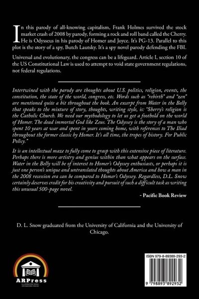 In this parody of all-knowing capitalism, Frank Holmes survived the stock market crash of 2008 by parody, forming a rock and roll band called the Cherry. He is Odysseus in his parody of Homer and Joyce. It's PG-13. Parallel to this plot is the story of a spy, Butch Lautsky. It's a spy novel parody defending the FBI.Universal and evolutionary, the congress can be a lifeguard. Article I, section 10 of the US Constitutional Law is used to attempt to void state government regulations, not federal regulations. D. L. Snow graduated from the University of California and the University of Chicago. Intertwined with the parody are thoughts about U.S. politics, religion, events, the constitution, the state of the world, congress, etc. Words such as "rebirth" and "zen" are mentioned quite a bit throughout the book. An excerpt from Water in the Belly that speaks to the mixture of story, thoughts, writing style, is: "Sherry's religion is the Catholic Church. We need our mythodology to let us get a foothold on the world of Homer. The dead immortal God like Zeus. The Odyssey is the story of a man who spent 10 years at war and spent in years coming home, with references to The Iliad throughout the former classic by Homer. It's all time, the tropes of history. For Public Policy." It is an intellectual maze to fully come to grasp with this extensive piece of literature. Perhaps there is more artistry and genius within than what appears on the surface. Water in the Belly will be of interest to Homer's Odyssey enthusiasts, or perhaps it is just one person's unique and untranslated thoughts about America and how a man in the 2008 recession era can be compared to Homer's Odyssey. Regardless, D.L. Snow certainly deserves credit for his creativity and pursuit of such a difficult task as writing this unusual 500-page novel. -Pacific Book Review