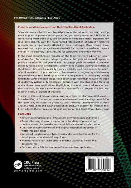 Properties and Formulation: From Theory to Real-World Application Scientists have attributed more than 40 percent of the failures in new drug development to poor biopharmaceutical properties, particularly water insolubility. Issues surrounding water insolubility can postpone or completely derail important new drug development. Even the much-needed reformulation of currently marketed products can be significantly affected by these challenges. More recently it was reported that the percentage increased to 90% for the candidates of new chemical entities in the discovery stage and 75% for compounds under development. In the most comprehensive resource on the topic, this third edition of Water-Insoluble Drug Formulation brings together a distinguished team of experts to provide the scientific background and step-by-step guidance needed to deal with solubility issues in drug development. Twenty-three chapters systematically describe the detailed discussion on solubility theories, solubility prediction models, the aspects of preformulation, biopharmaceutics, pharmacokinetics, regulatory, and discovery support of water-insoluble drugs to various techniques used in developing delivery systems for water-insoluble drugs. This book includes more than 15 water-insoluble drug delivery systems or technologies, illustrated with case studies and featuring oral and parenteral applications. Highlighting the most current information and data available, this seminal volume reflects the significant progress that has been made in nearly all aspects of this field. The aim of this book is to provide a handy reference for pharmaceutical scientists in the handling of formulation issues related to water-insoluble drugs. In addition, this book may be useful to pharmacy and chemistry undergraduate students and pharmaceutical and biopharmaceutical graduate students to enhance their knowledge in the techniques of drug solubilization and dissolution enhancement.