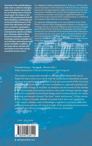 "This study is a major, first attempt to address comprehensively and in-depth the many issues associated with the institutional innovation in water resource management. This book consists of nine original papers by a team of scholars and experts in water institutions and policies." (JAWRA, August, 2006)
