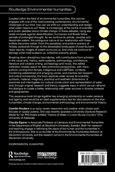 Located within the field of environmental humanities, this volume engages with one of the most pressing contemporary environmental challenges of our time: how can we shift our understanding and realign what water means to us? Water is increasingly at the centre of scientific and public debates about climate change. In these debates, rising sea levels compete against desertification; hurricanes and floods follow periods of prolonged drought. As we continue to pollute, canalise and desalinate waters, the ambiguous nature of our relationship with these entities becomes visible. From the paradisiac and pristine scenery of holiday postcards through to the devastated landscapes of post-tsunami news reports, images of waters surround us. And while we continue to damage what most sustains us, collective precarity grows.