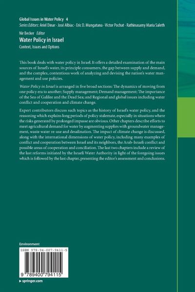 Water Policy in Israel is arranged in five broad sections: The dynamics of moving from one policy era to another; Supply management; Demand management; The importance of the Sea of Galilee and the Dead Sea; and Regional and global issues including water conflict and cooperation and climate change.