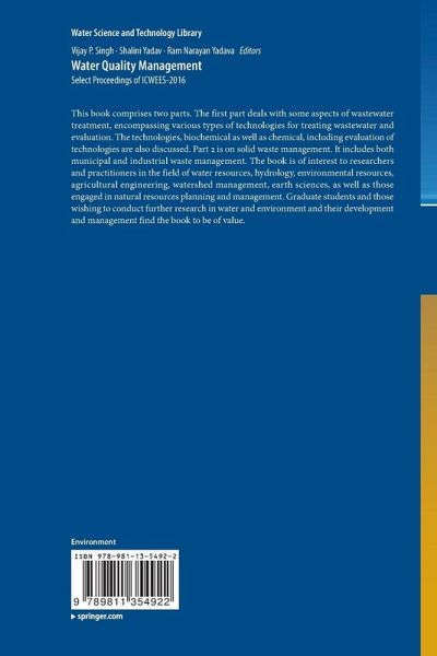This book comprises two parts. The first part deals with some aspects of wastewater treatment, encompassing various types of technologies for treating wastewater and evaluation. The technologies, biochemical as well as chemical, including evaluation of technologies are also discussed. Part 2 is on solid waste management. It includes both municipal and industrial waste management. The book is of interest to researchers and practitioners in the field of water resources, hydrology, environmental resources, agricultural engineering, watershed management, earth sciences, as well as those engaged in natural resources planning and management. Graduate students and those wishing to conduct further research in water and environment and their development and management find the book to be of value.