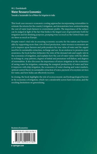 This book uses resource economics costing approaches incorporating externalities to estimate the returns for the country's irrigation and demonstrates how underestimating the cost of water leads farmers to overestimate profits. The importance of the subject can be judged in light of the fact that India is the largest user of groundwater both for irrigation and for drinking purposes, pumping twice as much as the United States and six times as much as Europe. Despite water's vital role in ensuring economic security for the nation and farmers alike by supporting more than 70% of food production, water resource economists are yet to impress upon farmers and policymakers the true value of water and the urgent need for its sustainable extraction, recharge and use. In an endeavor to promote more awareness, the book further delineates the roles of the demand side and supply side in the economics of irrigation, and explains how the cost of water varies with the efforts to recharge it, crop patterns, degrees of initial and premature well failure and degrees of externalities. It also discusses the importance of micro-irrigation in the economics of saving water for irrigation, estimating the marginal productivity of water and how it improves with drip irrigation, the economics of water sharing and water markets, optimal control theory in sustainable extraction of water, payment of ecosystem services for water and how India can effectively recover. In closing, the book highlights the role of socioeconomic and hydrogeological factors in the economics of irrigation, which vary considerably across hard rock areas and the resulting limitations on generalizing.