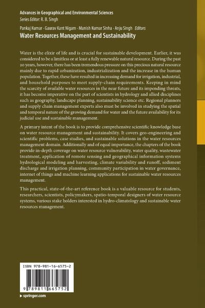Water is the elixir of life and is crucial for sustainable development. Earlier, it was considered to be a limitless or at least a fully renewable natural resource. During the past 20 years, however, there has been tremendous pressure on this precious natural resource mainly due to rapid urbanization, industrialization and the increase in the human population. Together, these have resulted in increasing demand for irrigation, industrial, and household purposes to meet supply-chain requirements. Keeping in mind the scarcity of available water resources in the near future and its impending threats, it has become imperative on the part of scientists in hydrology and allied disciplines such as geography, landscape planning, sustainability science etc. Regional planners and supply chain management experts also must be involved in studying the spatial and temporal nature of the growing demand for water and the future availability for its judicial use and sustainable management. A primary intent of the book is to provide comprehensive scientific knowledge base on water resource management and sustainability. It covers geo-engineering and scientific problems, case studies, and sustainable solutions in the water resources management domain. Additionally and of equal importance, the chapters of the book provide in-depth coverage on water resource vulnerability, water quality, wastewater treatment, application of remote sensing and geographical information systems hydrological modeling and harvesting, climate variability and runoff, sediment discharge and irrigation planning, community participation in water governance, internet of things and machine learning applications for sustainable water resources management. This practical, state-of-the-art reference book is a valuable resource for students, researchers, scientists, policymakers, spatio-temporal designers of water resource systems, various stake holders interested in hydro-climatology and sustainable water resources management.