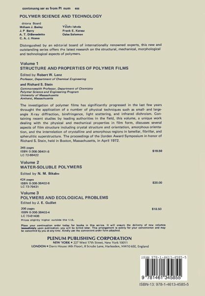 Water-soluble polymers have been attracting increasing atten tion because of their utility in industrial applications of great current concern. Perhaps preeminent among these is their ability to flocculate suspended solids, e.g., wastes in municipal sew age-treatment plants or pulp in papermaking. other important appli cations are to aid in so-called secondary recovery of petroleum, to reduce turbulent friction of water, and as components of water-based finishes developed in response to environmental con straints. Some water-soluble polymers have shown interesting bio logic activity, which is…mehr