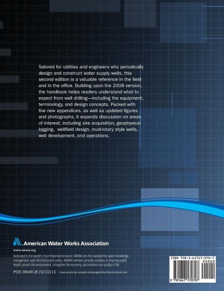 Designed for municipal water supply engineers, hydrogeologists, water utility managers, and water resource professionals, this book is AWWA's topdesk reference for any question regarding water wells, including siting, water quality, drilling methods, field testing, design, construction, development, and operation.You get professional and expert guidance in all aspects of water-well siting and drilling. A wealth of engineering data for design and construction, plus dozens of photographs and drawings, are included. The book describes and illustrates all common drilling methods, geophysical logging, and field testing. Well development, which may be the most important part of the well-drilling process for assuring well productivity and long life, is covered in detail.The book is designed to be a practical reference. Well operation and maintenance, including pump and motor maintenance, record keeping, water quality monitoring, and common operational problems, are explained thoroughly.