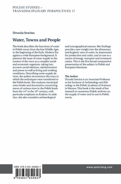 The book describes the functions of water in Polish towns from the late Middle Ages to the beginning of the Early-Modern Era against a wide European background. It presents the issue of water supply in the context of the town as a complex social and economic organism, taking into account social relations, administration and power as well as living and working conditions. Describing water supply devices, the author reconstructs the ways in which the techniques were transferred to the Polish lands. She analyses municipal court books and documents concerning towns of various sizes in the Polish lands from the 14th to the 16th century, with particular emphasis on Kraków. In addition, she also considers archaeological and iconographical sources. Her findings provide a new insight into the alimentary and hygienic uses of water, its importance for production and crafts, and its use as a source of energy, transport and communication. This is the first broad comparative presentation of the subject in Polish and European literature.