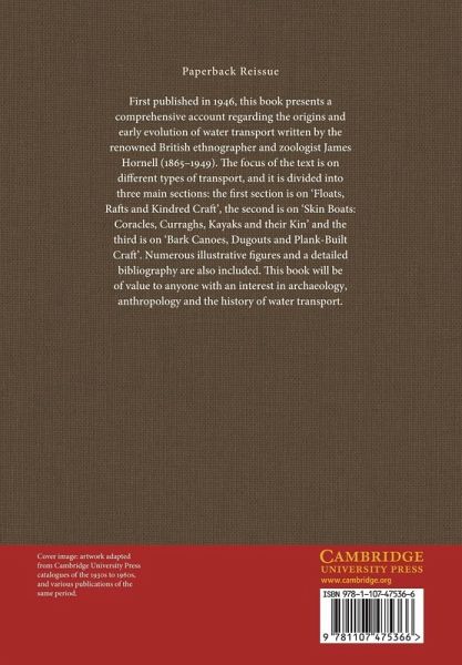 First published in 1946, this book presents a comprehensive account regarding the origins and early evolution of water transport written by the renowned British ethnographer and zoologist James Hornell (1865-1949). The focus of the text is on different types of transport, and it is divided into three main sections: the first section is on 'Floats, Rafts and Kindred Craft', the second is on 'Skin Boats: Coracles, Curraghs, Kayaks and their Kin' and the third is on 'Bark Canoes, Dugouts and Plank-Built Craft'. Numerous illustrative figures and a detailed bibliography are also included. This book will be of value to anyone with an interest in archaeology, anthropology and the history of water transport.