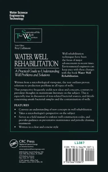 Well rehabilitation techniques have been the focus of major advancements in recent times. Environmental engineers can keep pace with those changes with the book Water Well Rehabilitation. Written from a microbiological viewpoint, the text outlines proven solutions to production problems in all types of wells. That perspective frequently yields new ideas and concepts, contrary to prevalent thoughts in mainstream literature on the subject. This is especially true in discussion of iron related bacterial sources, and details concerning unsafe bacterial samples and the contamination of wells. TOC:Introduction.- Definitions.- Identification of Problems in a Well.- Major Water Well Concerns.- Water Well Rehabilitation Techniques.- Supporting Figures and Plates to the Text.- Selected Bibliography.- Acknowledgments.