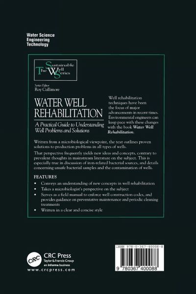 Well rehabilitation techniques have been the focus of major advancements in recent times. Environmental engineers can keep pace with recent advancements in well rehabilitation techniques, through Water Well Rehabilitation. Written from a microbiological viewpoint, the text outlines proven solutions to production problems in all types of wells. Contrary to prevalent thoughts in mainstream literature on the subject, this perspective occasionally yields new ideas and concepts. This is especially true in discussions of iron-related bacterial sources and details of unsafe bacterial samples and the contamination of wells.