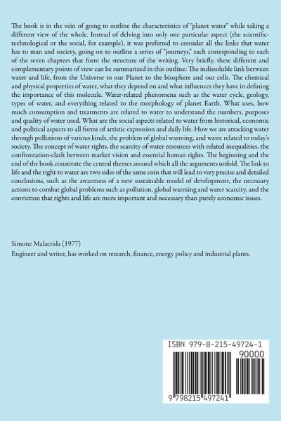 The book is in the vein of going to outline the characteristics of "planet water" while taking a different view of the whole. Instead of delving into only one particular aspect (the scientific-technological or the social, for example), it was preferred to consider all the links that water has to man and society, going on to outline a series of "journeys," each corresponding to each of the seven chapters that form the structure of the writing. Very briefly, these different and complementary points of view can be summarized in this outline: The indissoluble link between water and life, from the Universe to our Planet to the biosphere and our cells. The chemical and physical properties of water, what they depend on and what influences they have in defining the importance of this molecule. Water-related phenomena such as the water cycle, geology, types of water, and everything related to the morphology of planet Earth. What uses, how much consumption and treatments are related to water to understand the numbers, purposes and quality of water used. What are the social aspects related to water from historical, economic and political aspects to all forms of artistic expression and daily life. How we are attacking water through pollutions of various kinds, the problem of global warming, and waste related to today's society. The concept of water rights, the scarcity of water resources with related inequalities, the confrontation-clash between market vision and essential human rights. The beginning and the end of the book constitute the central themes around which all the arguments unfold. The link to life and the right to water are two sides of the same coin that will lead to very precise and detailed conclusions, such as the awareness of a new sustainable model of development, the necessary actions to combat global problems such as pollution, global warming and water scarcity, and the conviction that rights and life are more important and necessary than purely economic issues.