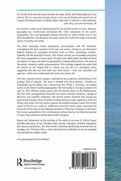 Our world is a water world. Seventy percent of our planet consists of ocean. However, geography has traditionally overlooked this vital component of the earth's composition. The word 'geography' directly translates as 'earth writing' and in line with this definition the discipline has preoccupied itself with the study of terrestrial spaces of society and nature. This book challenges human geography's preoccupation with the terrestrial, investigating the terra incognita of the seas and oceans. Linking to new theoretical debates shaping the geographic discipline (such as affect, assemblage, emotion, hybridity and the more-than-human), this volume unlocks new knowledge concerning the human geographies of ocean space. The book casts adrift stable, bounded and fixed conceptions of space and advances geographical understanding based on the world as 'becoming', changing, mobile and processional. This ontology supports the notion that the oceans are not simply fluid in a literal way, but also in a conceptual sense, suggesting that the seas have their own fluid natures - their own capacities and agencies - which are co-fabricated with social and cultural life. This book features twelve chapters, authored by key academics contributing to this growing field of research. The book is divided into three sections, including an Introduction by the editors and a foreword by Prof. Philip E. Steinberg, the leading scholar in the field of maritime geographies. The first section of the book considers the ways in which different watery spaces from the Atlantic Ocean to the Mediterranean Sea have been conceptualized, theorized and 'known' through metaphors, voyages of discovery and scientific endeavour. The second section examines how oceans are experienced; through various activities including driving on water, kayaking in water and diving under water. The final section explores the relations between human life and the nature of the sea as a material, mobile and more-than-human spa