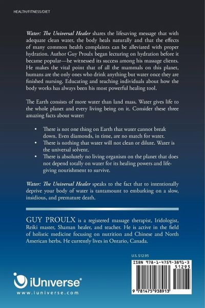 Water: The Universal Healer shares the lifesaving message that with adequate clean water, the body heals naturally and that the effects of many common health complaints can be alleviated with proper hydration. Author Guy Proulx began lecturing on hydration before it became popular-he witnessed its success among his massage clients. He makes the vital point that of all the mammals on this planet, humans are the only ones who drink anything but water once they are finished nursing. Educating and teaching individuals about how the body works has always been his most powerful healing tool. The Earth consists of more water than land mass. Water gives life to the whole planet and every living being on it. Consider these three amazing facts about water: ¿ There is not one thing on Earth that water cannot break down. Even diamonds, in time, are no match for water. ¿ Th ere is nothing that water will not clean or dilute. Water is the universal solvent. ¿ There is absolutely no living organism on the planet that does not depend totally on water for its healing powers and lifegiving nourishment to survive. Water: The Universal Healer speaks to the fact that to intentionally deprive your body of water is tantamount to embarking on a slow, insidious, and premature death.