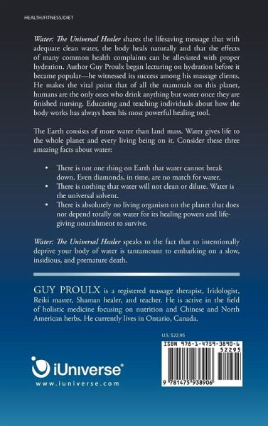 Water: The Universal Healer shares the lifesaving message that with adequate clean water, the body heals naturally and that the effects of many common health complaints can be alleviated with proper hydration. Author Guy Proulx began lecturing on hydration before it became popular-he witnessed its success among his massage clients. He makes the vital point that of all the mammals on this planet, humans are the only ones who drink anything but water once they are finished nursing. Educating and teaching individuals about how the body works has always been his most powerful healing tool. The Earth consists of more water than land mass. Water gives life to the whole planet and every living being on it. Consider these three amazing facts about water: ¿ There is not one thing on Earth that water cannot break down. Even diamonds, in time, are no match for water. ¿ Th ere is nothing that water will not clean or dilute. Water is the universal solvent. ¿ There is absolutely no living organism on the planet that does not depend totally on water for its healing powers and lifegiving nourishment to survive. Water: The Universal Healer speaks to the fact that to intentionally deprive your body of water is tantamount to embarking on a slow, insidious, and premature death.