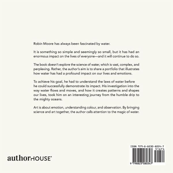 Robin Moore has always been fascinated by water. It is something so simple and seemingly so small, but it has had an enormous impact on the lives of everyone-and it will continue to do so. The book doesn't explore the science of water, which is vast, complex, and perplexing. Rather, the author's aim is to share a portfolio that illustrates how water has had a profound impact on our lives and emotions. To achieve his goal, he had to understand the laws of water before he could successfully demonstrate its impact. His investigation into the way water flows and moves, and how it creates patterns and shapes our lives, took him on an interesting journey from the humble drip to the mighty oceans. Art is about emotion, understanding colour, and observation. By bringing science and art together, the author calls attention to the magic of water.
