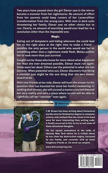 Two years have passed since the girl Elenor saw in the mirror became a monster from her nightmares. No amount of effort from her parents could keep rumors of her Lovecraftian transformation from the wrong ears. With men in dark suits threatening her family, Elenor saw no other choice but to run. Clearly, no amount of searching would ever lead her to a conclusion other than the impossible one. Magic. Eating out of dumpsters and hiding wherever she could lead her to the right place at the right time to make a friend - possibly the only person in the world who would see her as something other than a nightmare made flesh. Mateo pushes her to seek more than just survival. Sought out by those who know far more about what happened her than she ever dreamed possible, Elenor must run again. Some want her dead. Others see the potential in what she has become. When potential wins out, Elenor discovers that being a monster just might be the one thing that she was always meant to be. With new friends at her side, Elenor will hunt the answer to the question that has haunted her since her fateful awakening. In seeking that answer, she will unravel a mystery ancient beyond her very reality and earn a place where no one will be able to rightfully call her "monster" ever again.