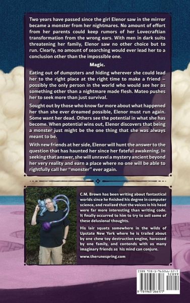 Two years have passed since the girl Elenor saw in the mirror became a monster from her nightmares. No amount of effort from her parents could keep rumors of her Lovecraftian transformation from the wrong ears. With men in dark suits threatening her family, Elenor saw no other choice but to run. Clearly, no amount of searching would ever lead her to a conclusion other than the impossible one. Magic. Eating out of dumpsters and hiding wherever she could lead her to the right place at the right time to make a friend - possibly the only person in the world who would see her as something other than a nightmare made flesh. Mateo pushes her to seek more than just survival. Sought out by those who know far more about what happened her than she ever dreamed possible, Elenor must run again. Some want her dead. Others see the potential in what she has become. When potential wins out, Elenor discovers that being a monster just might be the one thing that she was always meant to be. With new friends at her side, Elenor will hunt the answer to the question that has haunted her since her fateful awakening. In seeking that answer, she will unravel a mystery ancient beyond her very reality and earn a place where no one will be able to rightfully call her "monster" ever again.