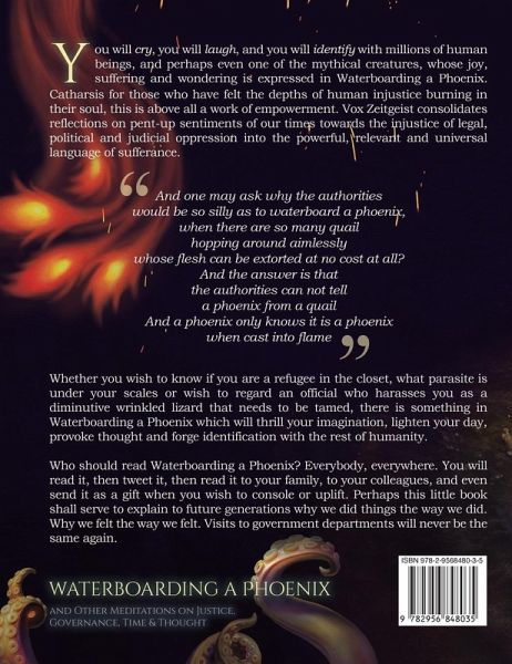 You will cry, you will laugh, and you will identify with millions of human beings, and perhaps even one of the mythical creatures, whose joy, suffering and wondering is expressed in Waterboarding a Phoenix. Catharsis for those who have felt the depths of human injustice burning in their soul, this is above all a work of empowerment. Vox Zeitgeist consolidates reflections on pent-up sentiments of our times towards the injustice of legal, political and judicial oppression into the powerful, relevant and universal language of sufferance. And one may ask why the authorities would be so silly as to waterboard a phoenix, when there are so many quail hopping around aimlessly whose flesh can be extorted at no cost at all? And the answer is that the authorities can not tell a phoenix from a quail And a phoenix only knows it is a phoenix when cast into flame Whether you wish to know if you are a refugee in the closet, what parasite is under your scales or wish to regard an official who harasses you as a diminutive wrinkled lizard that needs to be tamed, there is something in Waterboarding a Phoenix which will thrill your imagination, lighten your day, provoke thought and forge identification with the rest of humanity. Who should read Waterboarding a Phoenix? Everybody, everywhere. You will read it, then tweet it, then read it to your family, to your colleagues, and even send it as a gift when you wish to console or uplift. Perhaps this little book shall serve to explain to future generations why we did things the way we did. Why we felt the way we felt. Visits to government departments will never be the same again.