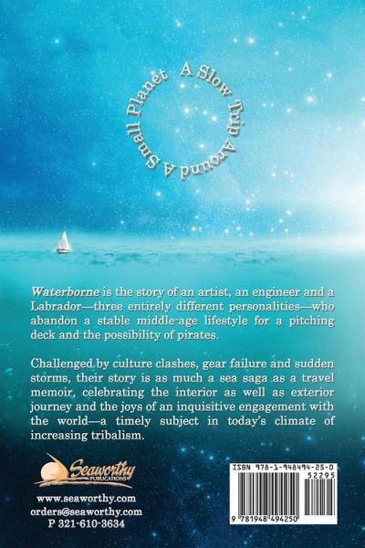 "Waterborne" is the story of an artist, an engineer and a Labrador—three entirely different personalities—who abandon a stable middle-age lifestyle for a pitching deck and the possibility of pirates. Challenged by culture clashes, gear failure and sudden storms, their story is as much a sea saga as travel memoir, celebrating the interior as well as exterior journey and the joys of an inquisitive engagement with the world—a timely subject in today’s climate of increasing tribalism.