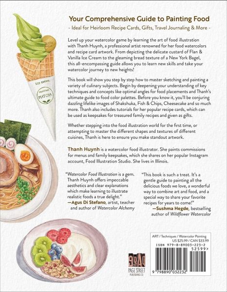Your Comprehensive Guide to Painting Food Level up your watercolor game by learning the art of food illustration with Thanh Huynh, a professional artist renowned for her food watercolors and recipe card artwork. From depicting the delicate custard of Flan & Vanilla Ice Cream to the gleaming bread texture of a New York Bagel, this all-encompassing guide allows you to learn new skills and take your watercolor journey to new heights! This book will show you step by step how to master sketching and painting a variety of culinary subjects. Begin by deepening your understanding of key techniques and concepts like optimal angles for food placements and Thanh's ultimate guide to food color palettes. Before you know it, you'll be conjuring dazzling lifelike images of Shakshuka, Fish & Chips, Cheesecake and so much more. Thanh also includes tutorials for her popular recipe cards, which can be used as keepsakes for treasured family recipes and given as gifts. Whether stepping into the food illustration world for the first time, or attempting to master the different shapes and textures of different cuisines, Thanh is here to ensure you make standout artwork.