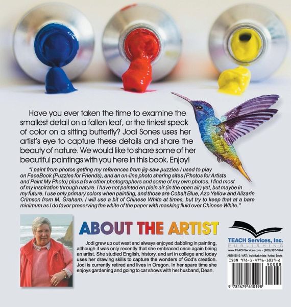 Have you ever taken the time to examine the smallest detail on a fallen leaf, or the tiniest speck of color on a sitting butterfly? Jodi Sones uses her artist's eye to capture these details and share the beauty of nature. We would like to share some of her beautiful paintings with you here in this book. Enjoy! "I paint from photos getting my references from jig-saw puzzles I used to play on FaceBook (Puzzles for Friends), and an on-line photo sharing sites (Photos for Artists and Paint My Photo) plus a few other photographers and some of my own photos. I find most of my inspiration through nature. I have not painted en plein air (in the open air) yet, but maybe in my future. I use only primary colors when painting, and those are Cobalt Blue, Azo Yellow and Alizarin Crimson from M. Graham. I will use a bit of Chinese White at times, but try to keep that at a bare minimum as I do favor preserving the white of the paper with masking fluid over Chinese White."