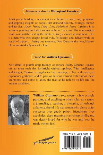 What you're holding in your hands is testament to a lifetime of witty, wry, poignant, and gripping insights on topics that demand honesty, courage, humor, and resolve. Aging. Honor. Dying. Love. Fatherhood. Poetry. Cipriano is as at home penning an Italian sonnet as he is free verse. His is an original voice, comfortable testing the limits of irony as much as sentiment. This is a man who lived deeply, loved truly, felt keenly, and delivers with the touch of a poet . . . being one moment, Don Quixote; the next, Hector. He is unmistakably one of a kind.
