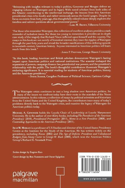 "Brimming with insights relevant to today's politics, Genovese and Morgan deliver an engaging volume on Watergate and its institutional legacy. With noted scholars from both sides of the Atlantic contributing to the intellectual exchange, the lessons from this American presidential crisis echo loudly and rather ominously across the book's pages. More than once, readers are asked to consider downside of the political system's separation of powers. Despite its focus on a series of events which happened over forty years ago, this thoughtfully edited volume more deeply explores the timeless and salient questions about governmental power.' - Lara M. Brown, Villanova University