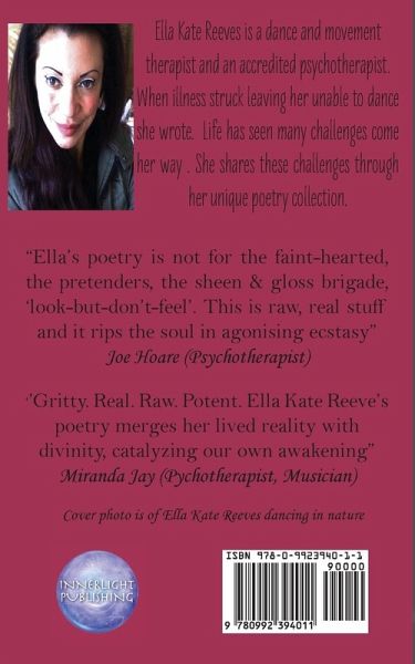 Ella Kate Reeves is a dance and movement therapist and an accredited psychotherapist. When illness struck leaving her unable to dance she wrote. Life has seen many challenges come her way . She shares these challenges through her unique poetry collection. Testimonials Anne Geragthy (Author) "Kate's poetry is not only original and beautiful it is challenging and visionary. Her poems take us into her journey and, as we read them, her struggles and surrenders become ours. She takes us with her into unfamiliar terrain, where her words themselves become elements of a living landscape. And Kate's journey is neither mundane nor predictable. She is living with challenges and demands that would floor many of us, yet she manages to transmute pain and loss into mystery and wonder. Kate's poetry performs the great alchemical transformation - from the chaos of human suffering into the creation of beauty, love, truth and a wisdom that knows there is something greater than pain and struggle, greater even than death. And this is the true beauty of her poetry. It shines with a light we all need. Thank you Kate - keep writing!" Miranda Jay (Psychotherapist, Musician) ''Gritty. Real. Raw. Potent. Ella Kate Reeve's poetry merges her lived reality with divinity, catalyzing our own awakening. An alchemist of our times extracting the soulful essence of truth, she casts her irons in the fires and we feel the heat as her words burn away. Her poetry is alive and lucid, a kind of Plutonic medicine that dances into our soul; an intimate waltz with death, loss, transformation and rebirth. Her poems should carry a warning label: Read at your own risk." Lisa Lovebucket (Author) "'Ella Kate Reeves is a new archetype: the kind of human being we need at the forefront if we are to weather the oncoming storm and come out thriving when the sun shines down on us once again. Kate can burn up the pain of the world in her little finger; envelop and annul it with her words; beguile and disperse it with her dance. Like a phoenix rising through an ice storm, she shines her light and warmth all around, melting hearts and inspiring minds as she soars ever upwards. Her every action abounds with the beauty and grace with which she conquers suffering and hardship, overcoming personal trials and adversity, and leading us all back to the light: a majestic homecoming 'indeed." Ross James Brown (Dancer, Poet) "Your words directly connect me to the place I feel whole, complete, breaking through layers and layers of deep truth, taking me on little internal journey, powerful, so inspiring, gifted soul!" Joe Hoare (Psychotherapist) "Ella's poetry is not for the faint-hearted, the pretenders, the sheen & gloss brigade, and 'look-but-don't-feel'. This is raw, real stuff and it rips the soul in agonising ecstasy. Please keep writing." Wanda Ponder (Life coach/Yoga teacher) "Your poetry just leaves me reeling, dumbstruck, not sure what I'm feeling, your heart and soul bared to the world revealing, your inner truth, no concealing, and your words filled with so much magic and healing..."
