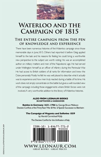 The entire campaign from the pen of knowledge and experience There have been numerous histories of the Waterloo campaign since those memorable days in June,1815. Others had reported it before Gleig applied himself to the task and his reasons for feeling he could bring a worthwhile new perspective to the subject are worth noting. He was an accomplished author on military matters and men of the Napoleonic age. He had served under Wellington himself as an officer of infantry during the Peninsular War. He had access to British soldiers of all ranks for information and knew the Duke personally. Mostly he felt he was well placed to describe what it actually was to experience and how men truly reacted during a battle of his time. His work does not simply concentrate on the battle but gives a well rounded view of the campaign including those engagements where British forces were not involved. A very worthwhile addition to the library of Waterloo histories.