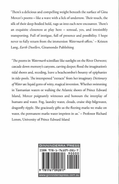 'There's a delicious and compelling weight beneath the surface of Gina Mercer's poems - like a wave with a lick of undertow. Their touch, the silk of their deep-bodied hold, tugs us into each new encounter. There's an exquisite closeness at play here - sensual, yes, and irresistibly transporting. Full of intrigue, full of presence and possibility. I hope never to fully return from the immersion Watermark offers.' - Kristen Lang, Earth Dwellers, Giramondo Publishing 'The poems in Watermark scintillate like sunlight on the River Derwent; cascade down memory's canyons, carving deeper; flood the imagination's tidal shores and, receding, leave a beachcomber's bounty of epiphanies in tide-pools. The interspersed "extracts" from her imaginary Dictionary of Water are liquid gems of witty, magical invention. Whether swimming in Tasmanian waters or walking the Atlantic shores of Prince Edward Island, Mercer poignantly witnesses and honours the interplay of humans and water. Fog, laundry water, clouds, cruise ship bilgewater, dragonfly ripple. She graciously gifts us the fleeting marks we make on water, the permanent marks water imprints in us.' - Professor Richard Lemm, University of Prince Edward Island